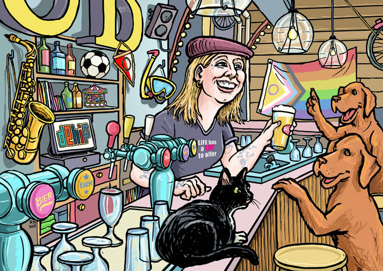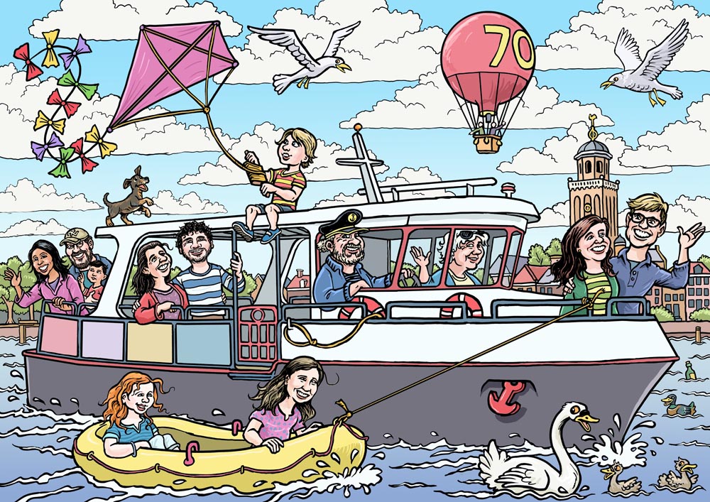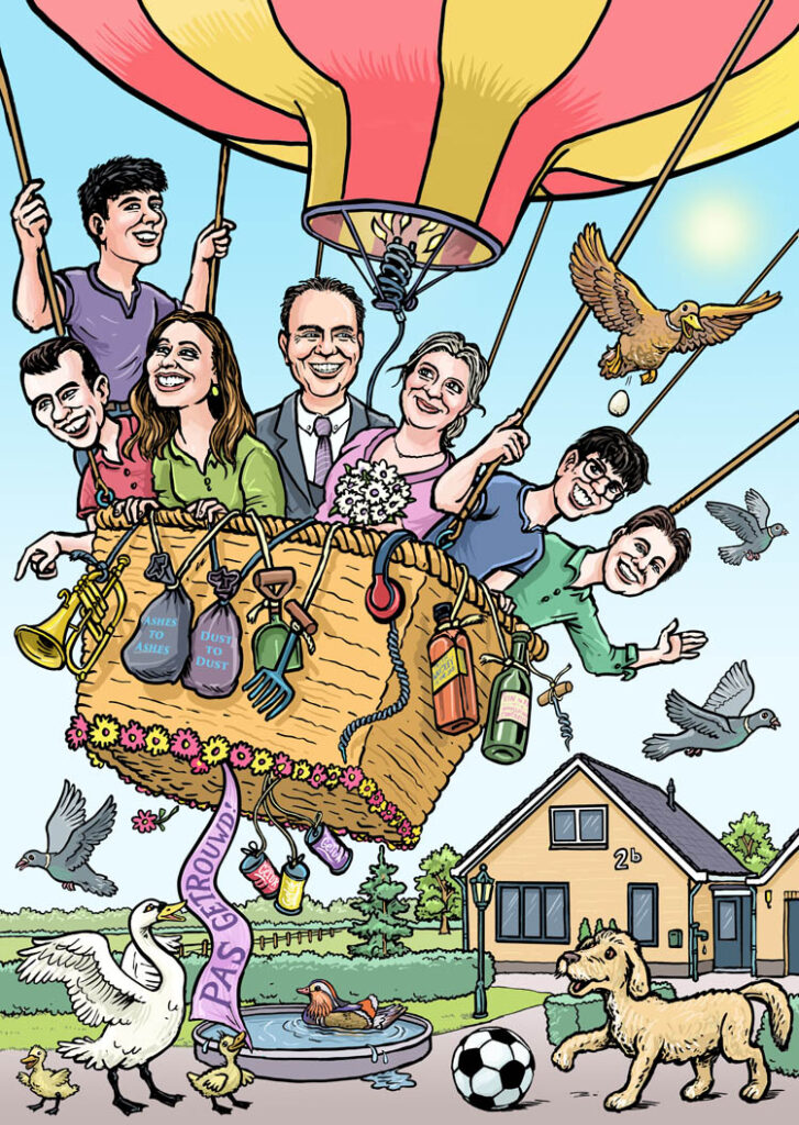 Op mijn cartoons en tekeningen staan heel vaak menselijke figuren of poppetjes afgebeeld. Maar regelmatig komt er een opdracht binnen om speciaal voor een collega, familielid of van de eigen persoon een leuke tekening te maken. Vaak is er een bijzondere gelegenheid, zoals een verjaardag, huwelijk of jubileum. Een tekening voor iemand is altijd een persoonlijk geschenk, dus ik probeer er ook altijd voorwerpen in te verstoppen die iets met die persoon te maken hebben.